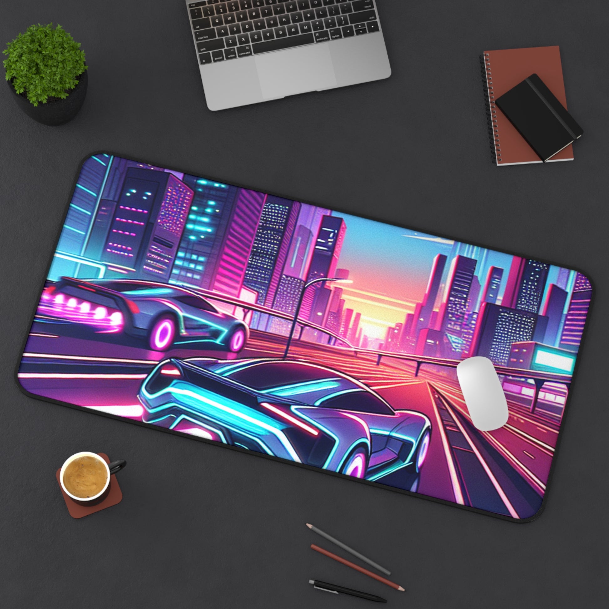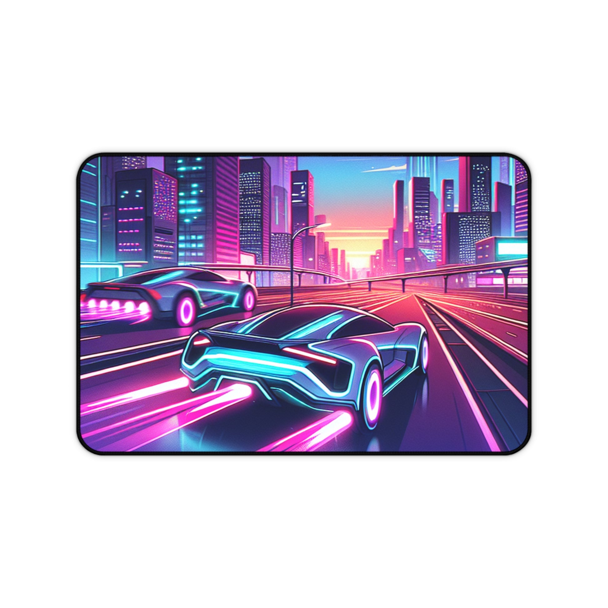 Neon Cityscape Desk Mat - Futuristic Car Design for Gamers & Desk Enthusiasts